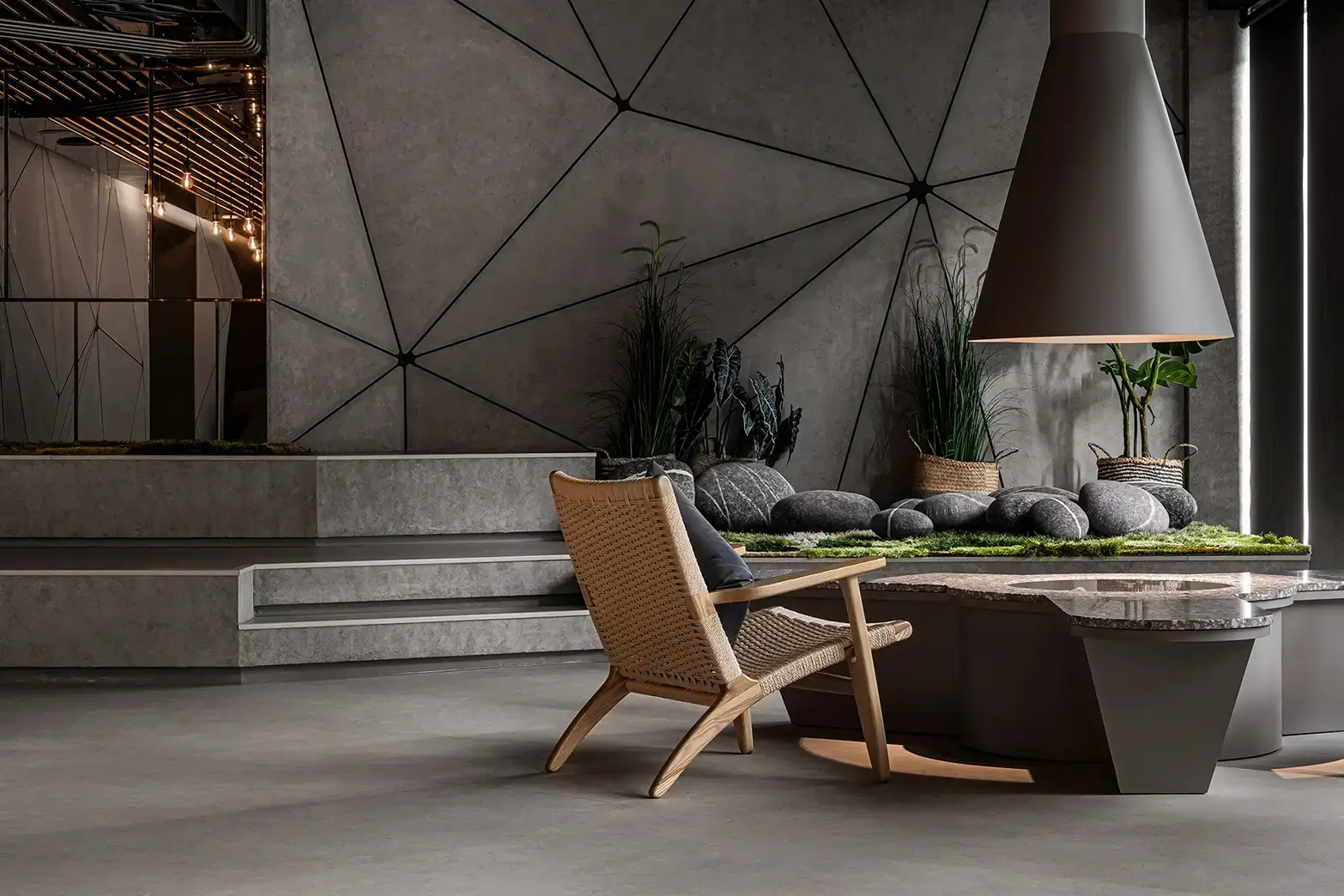 以⾃然律動為靈感,紅柴.居 Hayata Hotel 的公共區域採⽤沉浸式體驗導向的商業空間設計⼿法,打造如海洋層疊的空間節奏,充滿淺灘意象的⼀樓⼤廳鋪陳礁⽯、營⽕與苔蘚,營造開放且富交流感的迎賓氛圍︔頂端垂掛如洋流般的⾦屬管線與錯落燈泡,展現海洋⽣物浮游的流動感。