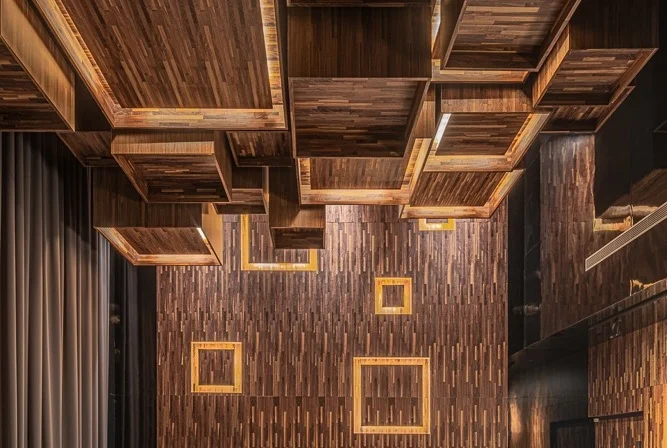 泰郡建設 悅讀泰郡的整體動線從接待大廳延伸至各功能空間,透過高低錯落的線性層次與不同材質元素,引導視覺與節奏。材質選用石材、木質、金屬與鏡面等異材質交錯搭配,營造出精品宅獨有的層次與質感。雪茄吧天花板垂直線條交織空間律動,生活廚房導入義式層架與中島概念,健身空間則以燈帶與色塊區分功能,成為一例結合生活與精品感的室內設計典範。